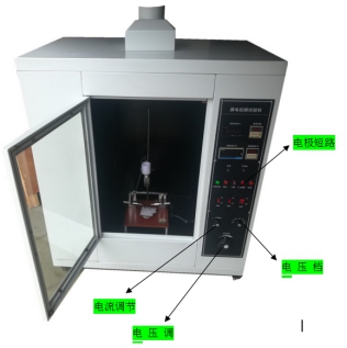 試驗(yàn)時(shí),將截面為2mm×4mm的兩個(gè)鉑電極對(duì)稱地安放在試驗(yàn)樣品表面,夾角60°,兩電極正面相對(duì),且距離4mm。每個(gè)電極對(duì)試樣表面的作用力為(1.00±0.05)No電解液從30mm~40m的高度滴落在電極間的試樣表面上,液滴大小為20+3mm3。電解液以(30±5)秒的時(shí)間間隔滴落,直到試樣發(fā)生破壞或者滴完50滴為止。當(dāng)在試樣表面兩電極間的通路流過0.5A或更大的電流,過電流繼電器延時(shí)2秒動(dòng)作時(shí),或過電流繼電器雖未動(dòng)作,但試樣燃燒了,均認(rèn)為已破壞。